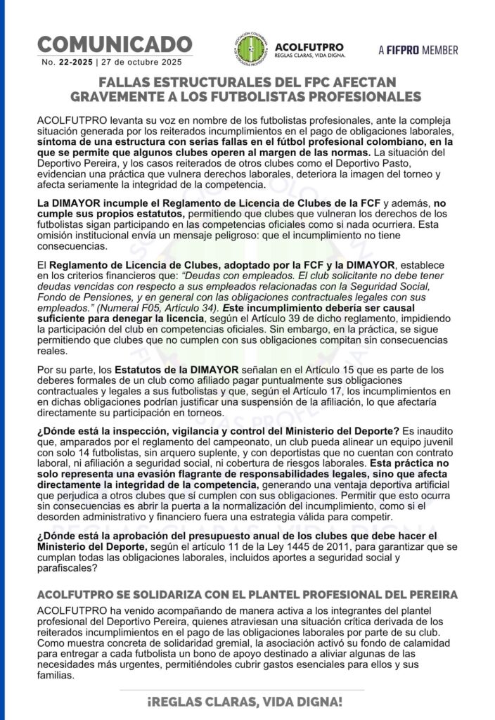 “Los futbolistas del Pereira enfrentan una situación crítica que vulnera su dignidad laboral y la de sus familias”, manifestó el gremio, reiterando su llamado a las autoridades del fútbol y al Gobierno Nacional para aplicar las normas y garantizar condiciones laborales justas.