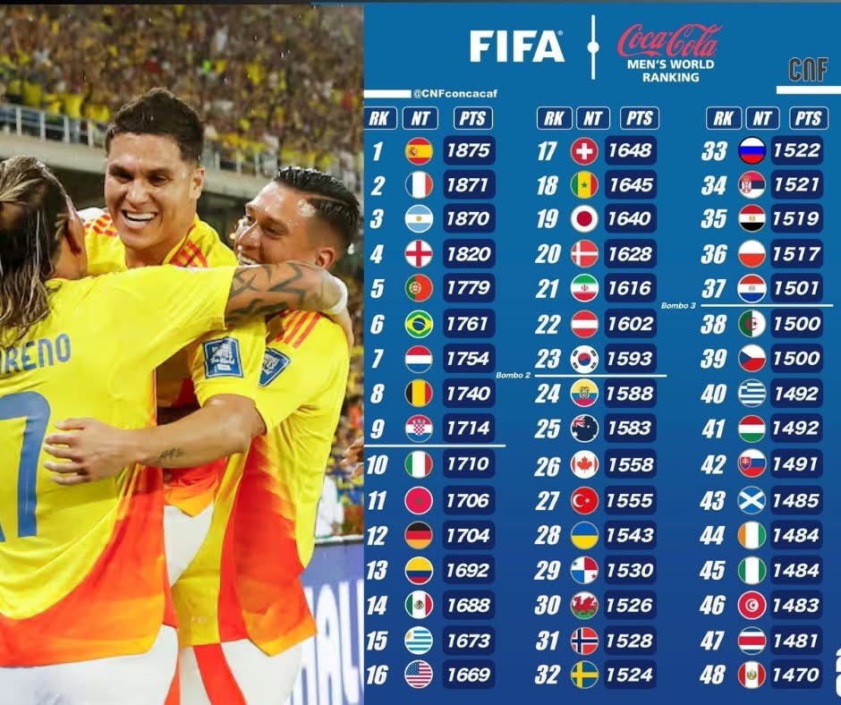 La Tricolor ascendió al puesto 13 en la clasificación publicada el 17 de septiembre, con 1.692,11 puntos, superando a México, que ya tiene su lugar asegurado como anfitrión. Para meterse entre las nueve mejores del mundo y ser cabeza de grupo, Colombia debe escalar cuatro posiciones, superando a Alemania (11°), Italia (10°), Croacia (9°) y Marruecos (12°).