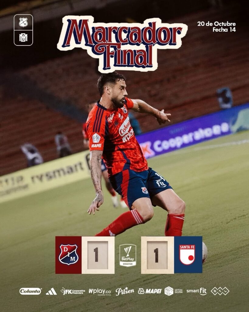 Con este empate, Independiente Medellín llegó a 31 puntos y se mantiene en lo más alto de la tabla. Santa Fe, por su parte, ocupa la octava posición con 22 unidades.